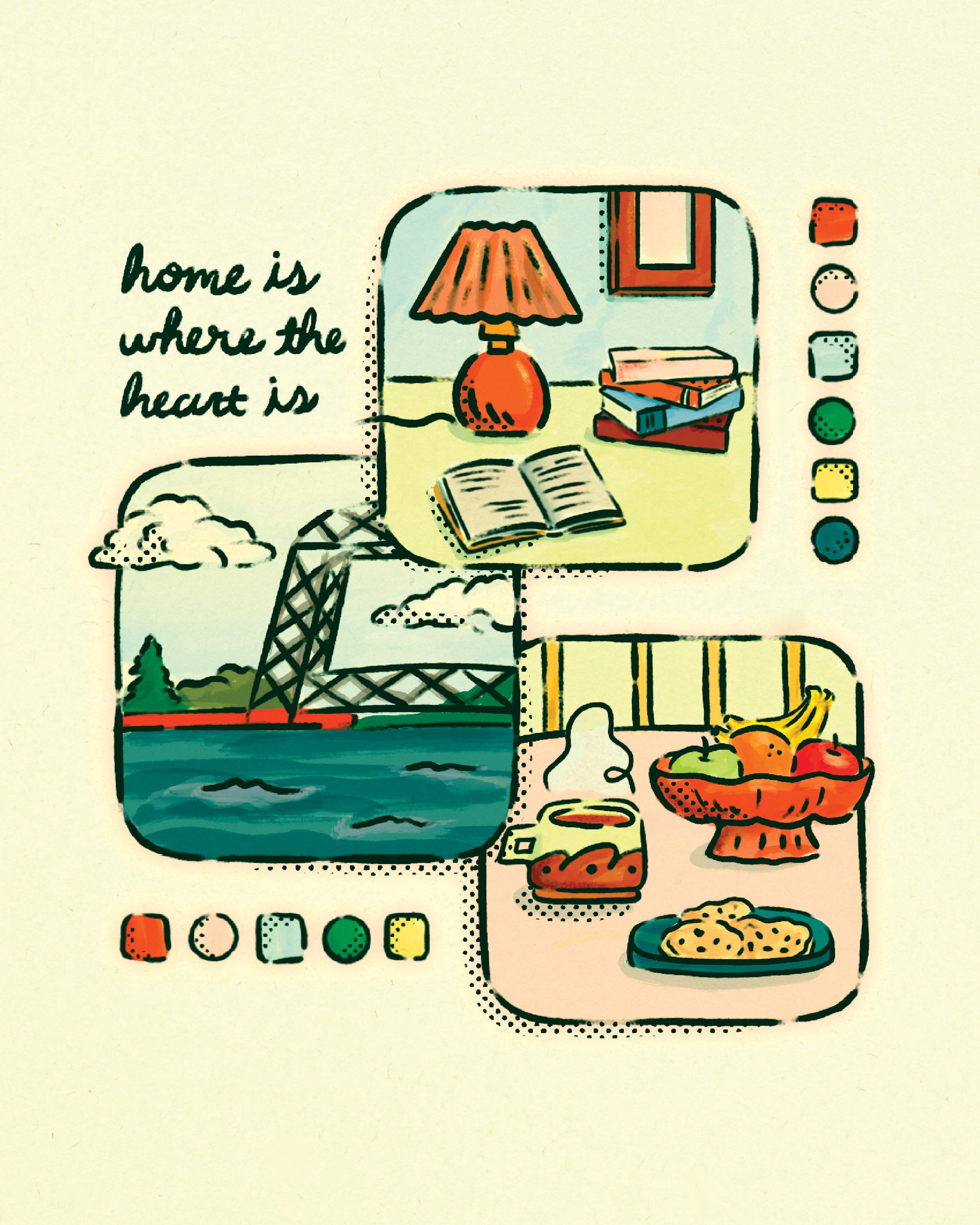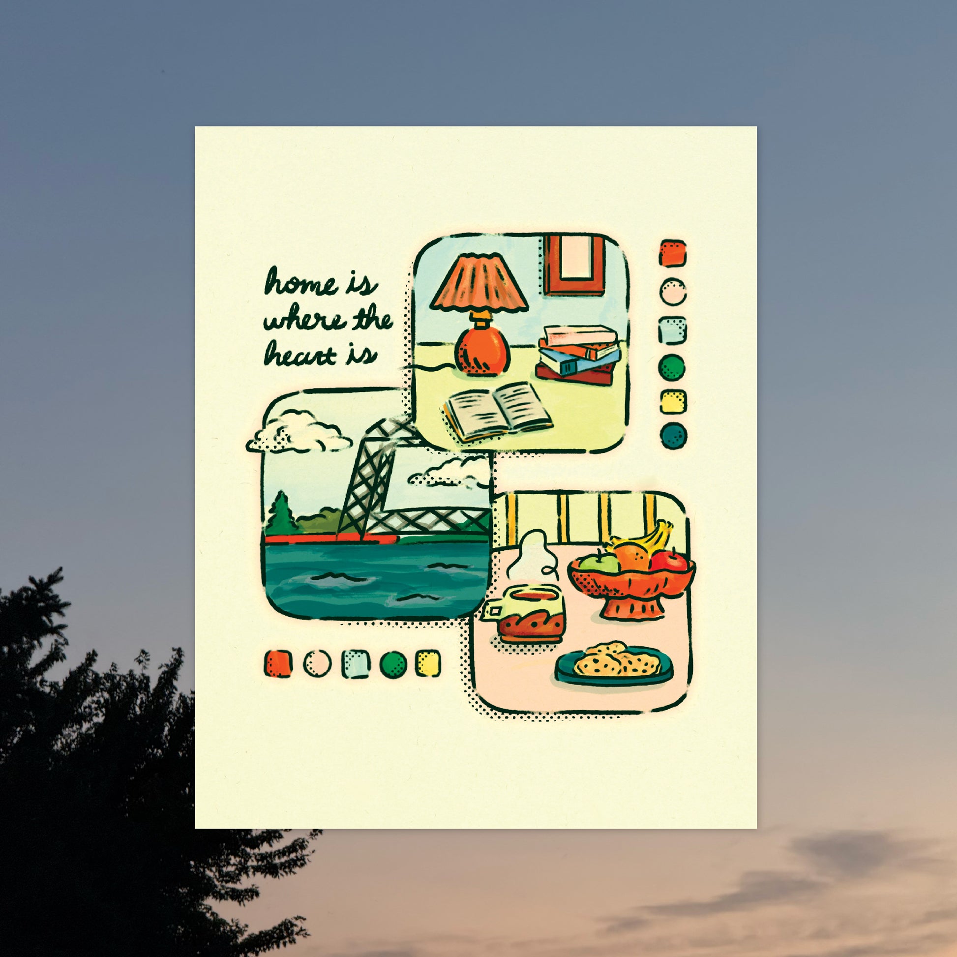 Home Is - An illustrated print of cozy home scenes like a reading nook, fresh-baked cookies and coffee, and a lake scene inspired by Duluth, MN.