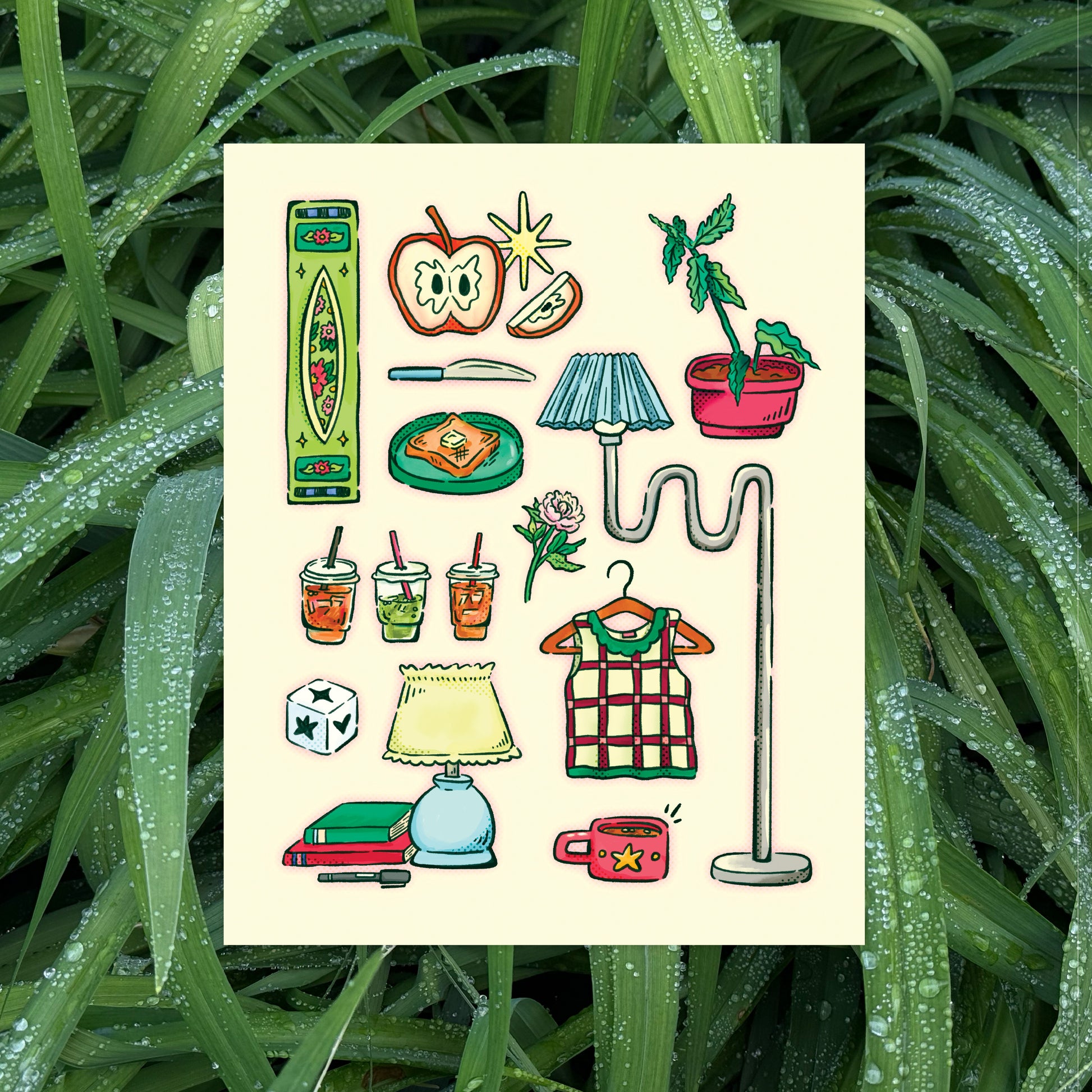 Summer Assortment - An illustrated print of various summery items! From iced bevs & summer eats, to houseplants & cozy lamps!