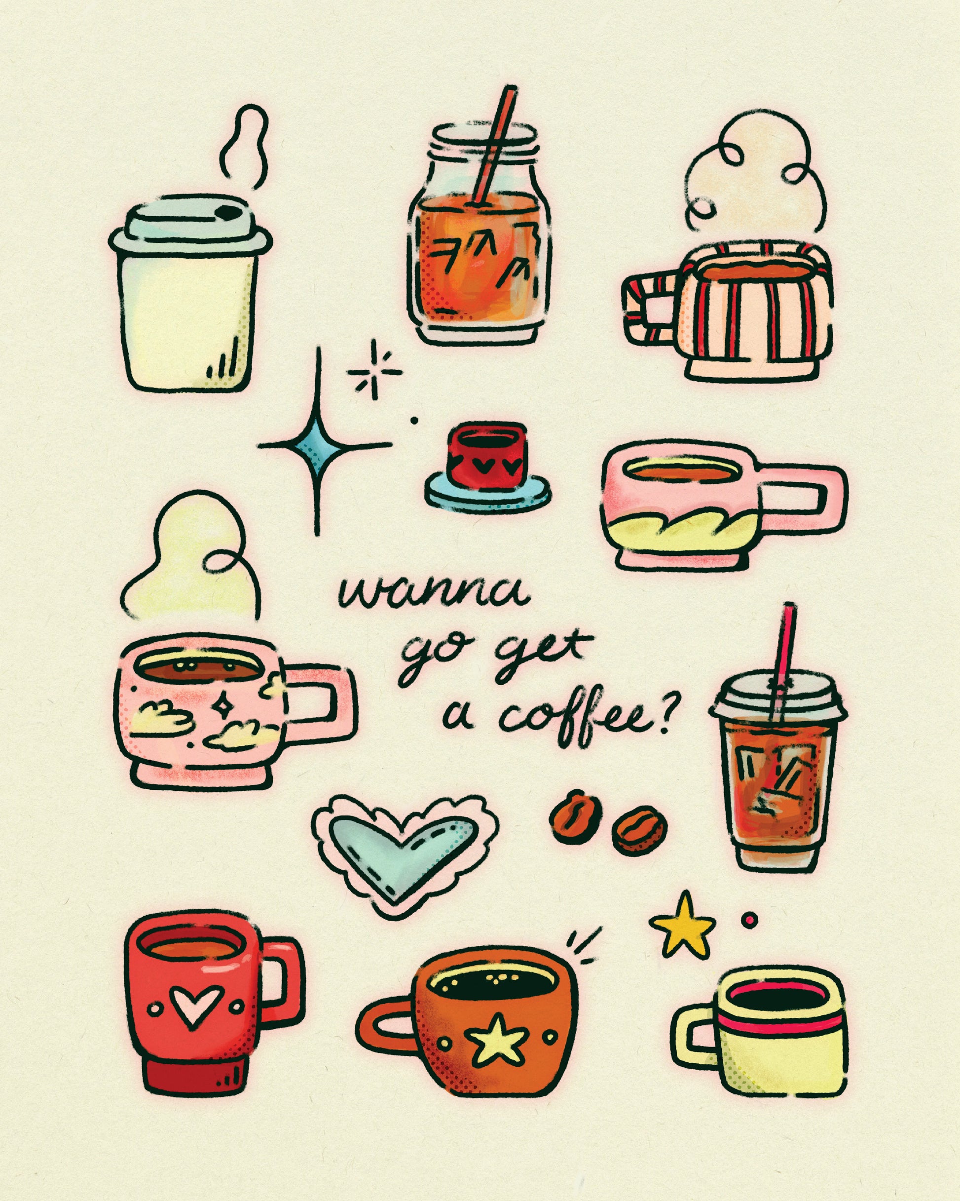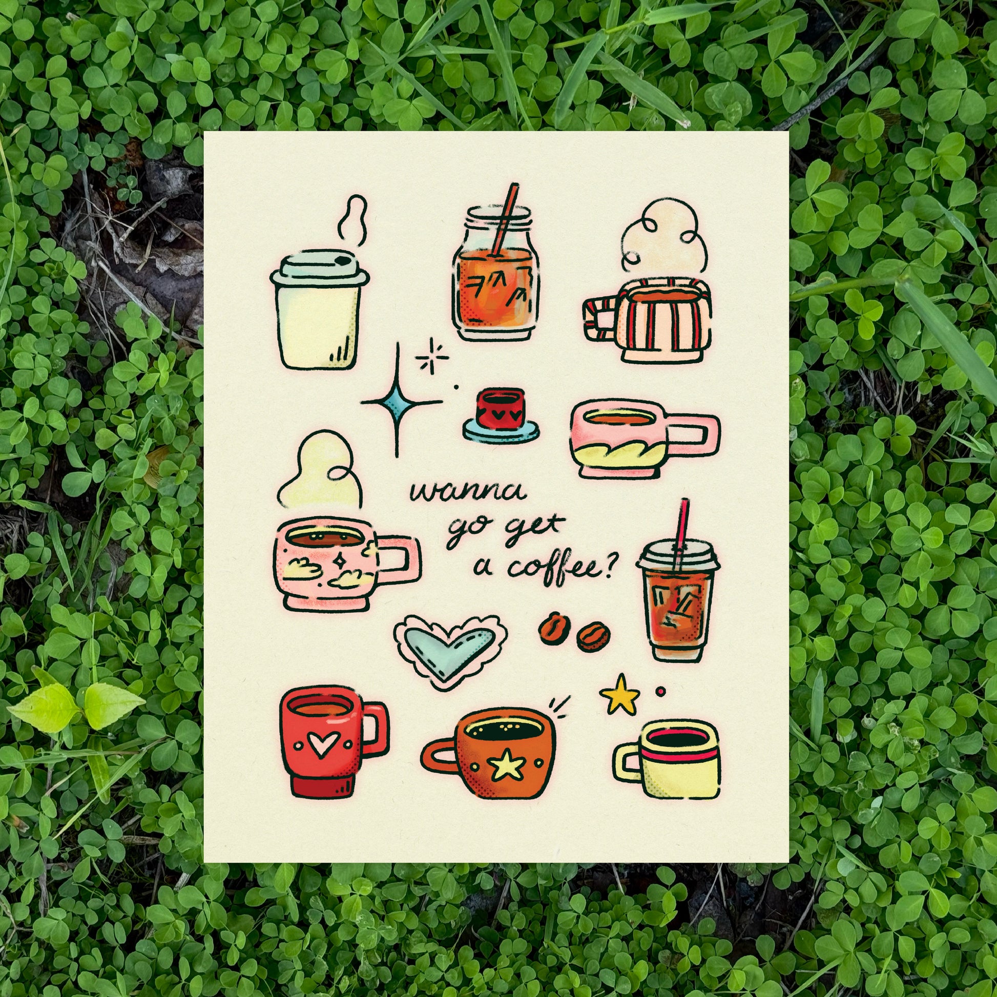 Wanna Go Get a Coffee - An illustrated print of various coffee drinks alongside the question "Wanna go get a coffee?" Perfect to give to your favorite coffee date!